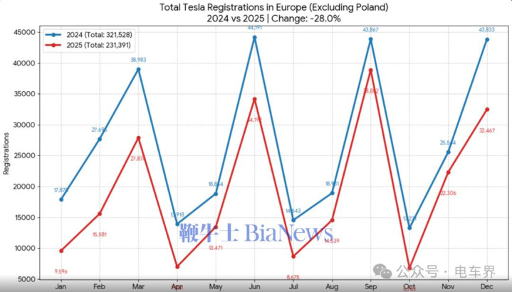 据欧洲主要市场汽车注册量数据统计,特斯拉2025年总销量从2024年的约32.6万辆降至略超23.5万辆,同比暴跌27.8%。